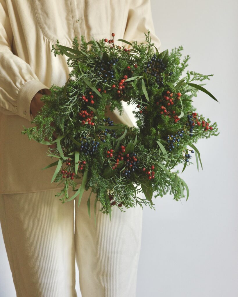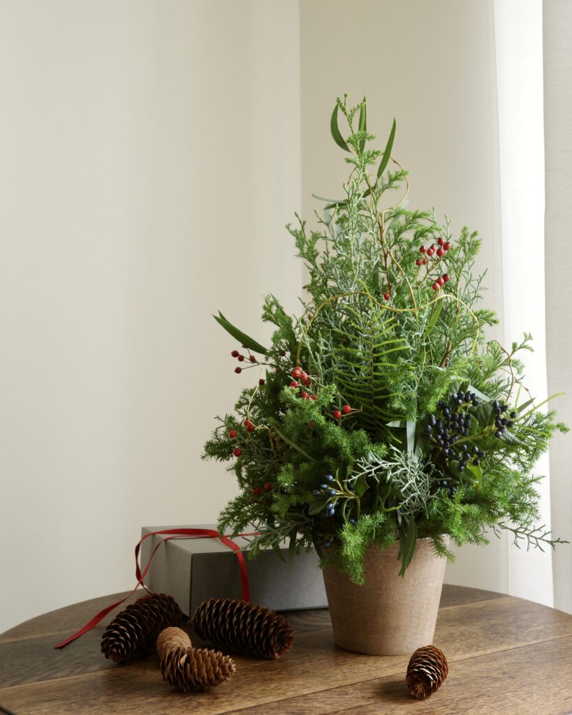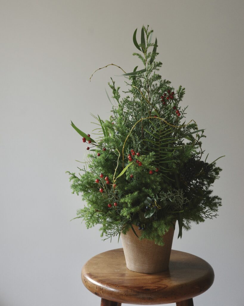 今年は針葉樹たっぷりにシンプルな飾り付けのリースとツリーアレンジメントを楽しみます。